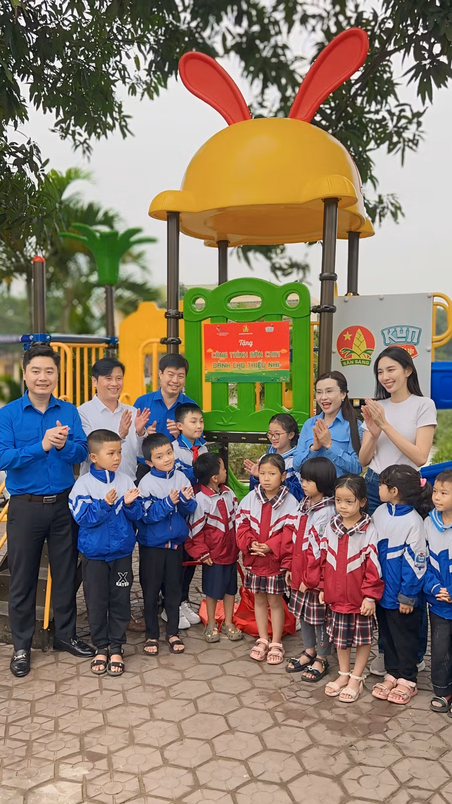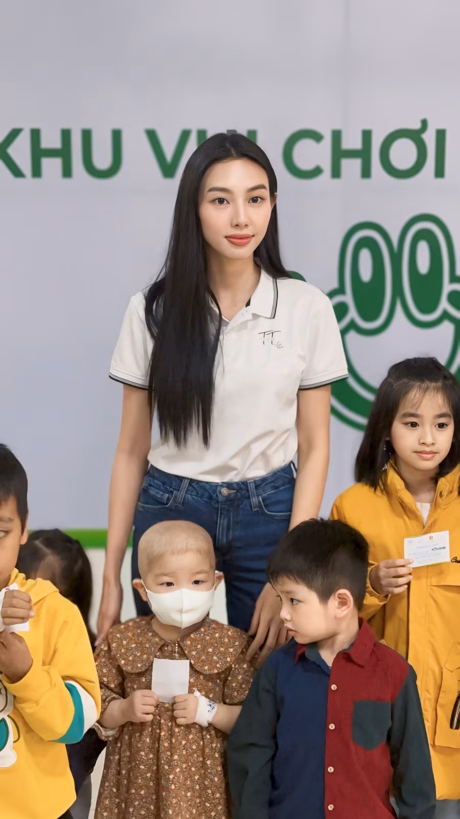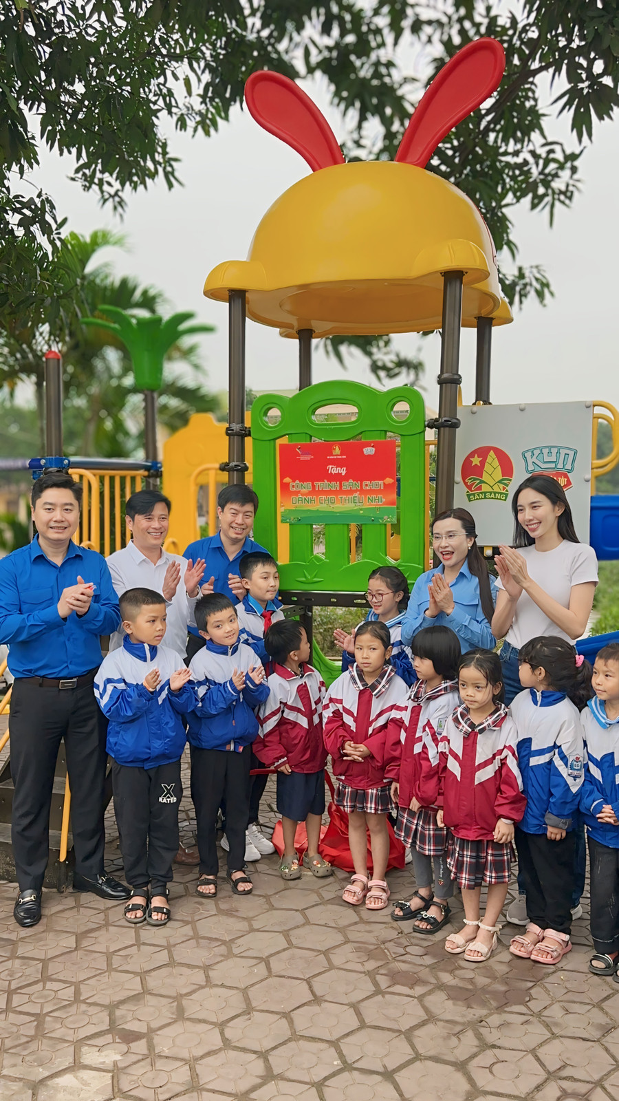 Sau lịch trình dày đặc, Hoa hậu Thùy Tiên đã dành thời gian đến Bệnh viện Nhi Thanh Hóa để nghiệm thu sân chơi cùng với sự giúp sức của Hội đồng Đội Trung ương.