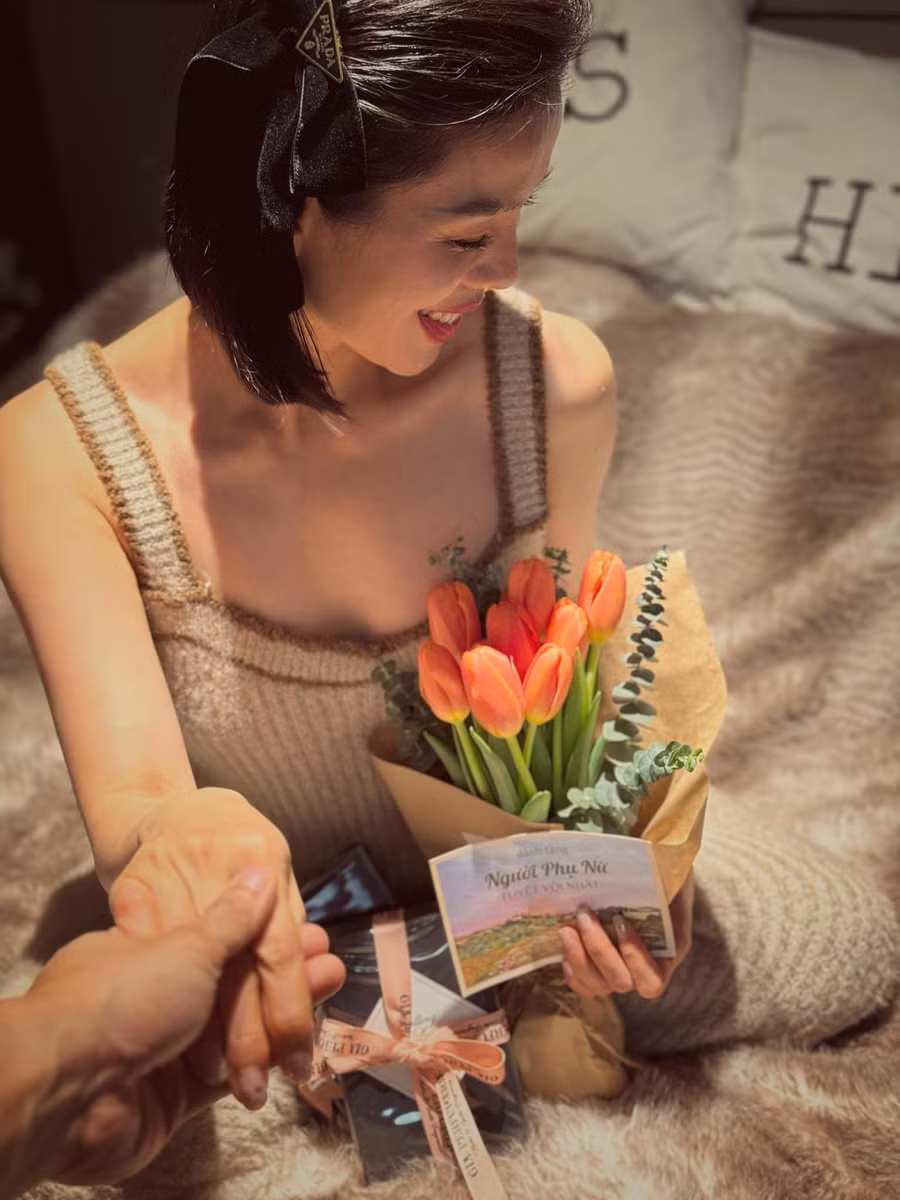 Nữ ca sĩ Lệ Quyên chia sẻ niềm hạnh phúc khi được Lâm Bảo Châu dành tặng món quà ý nghĩa nhân ngày 8/3. Nữ ca sĩ cho biết: "8/3 của Quyên đây. Chúc các nàng ngoan xinh yêu thật happy trong ngày chúng ta được đặc cách muốn sao cũng được nhé".