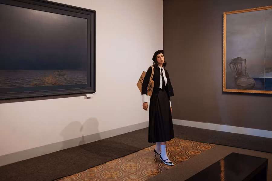 Mỹ nhân Tiểu Vy còn hóa thân thành “cô chiêu” xứ Âu trong bộ trang phục mang phong cách preppy cổ điển. “Nàng nữ sinh duyên dáng” chọn phối áo sơ mi croptop trắng cùng chiếc jacket và chân váy dài màu đen tương phản.