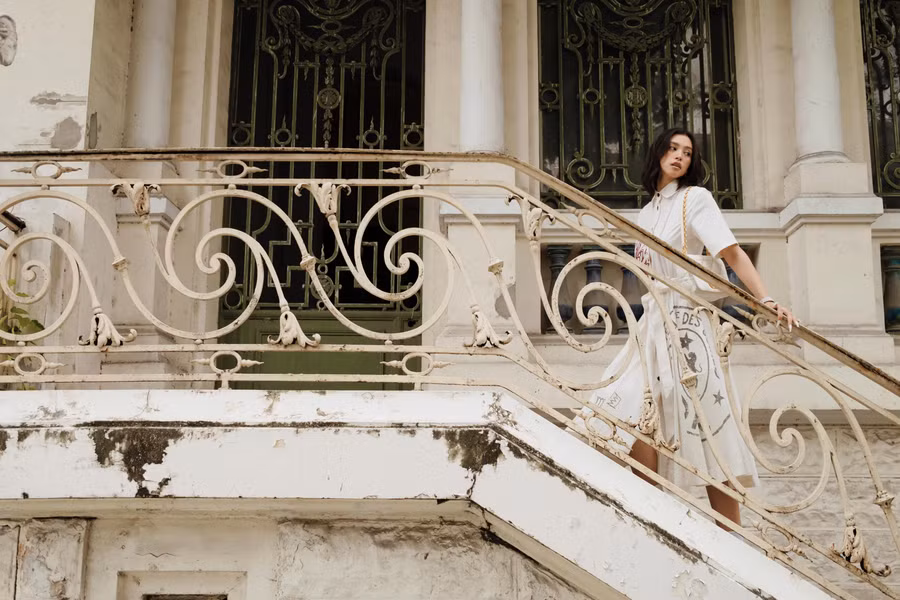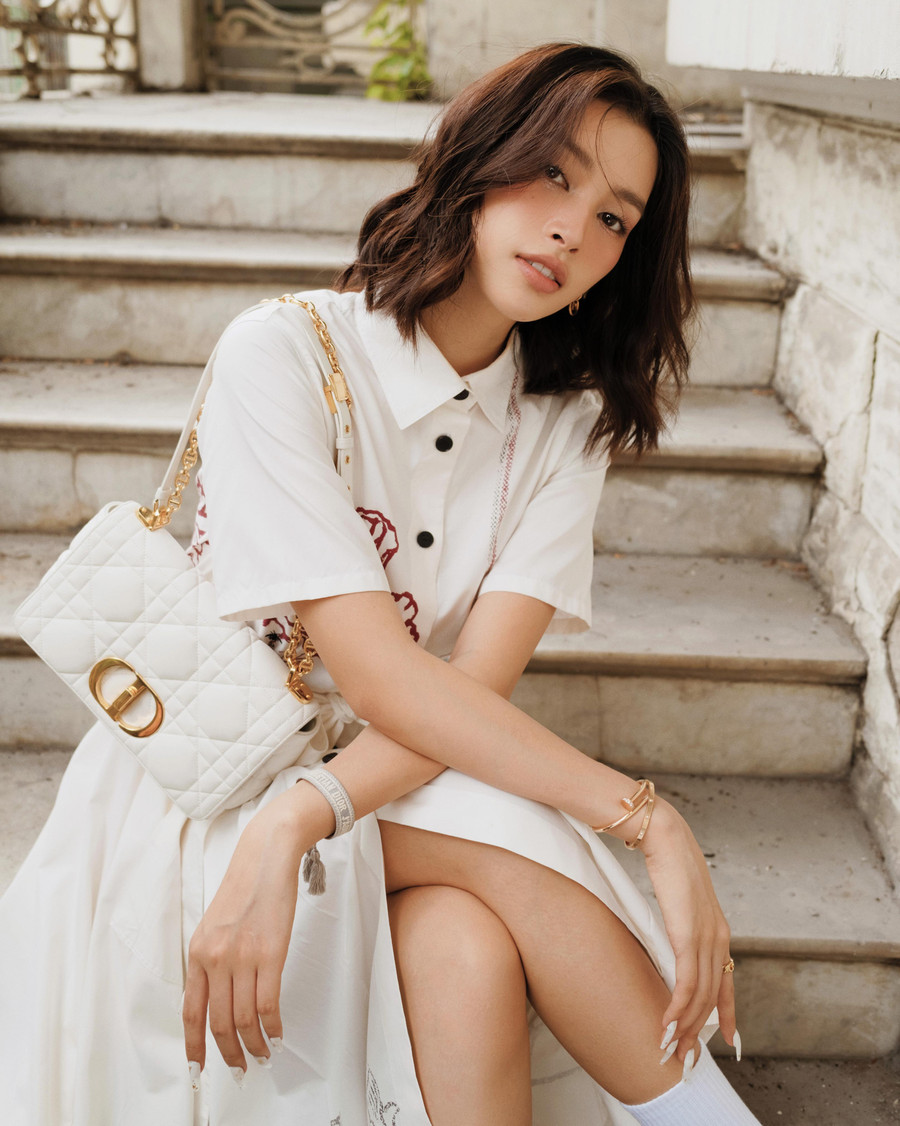Trong bộ hình lần này, Tiểu Vy diện chiếc váy sơ mi màu beige cổ điển với logo đặc trưng của thương hiệu Dior. Nàng Hậu tuổi 21 lựa chọn phối với chiếc Dior Caro Bag màu trắng thanh lịch, vớ cao cùng đôi Dior Motion Pump mang vẻ đẹp quý tộc.