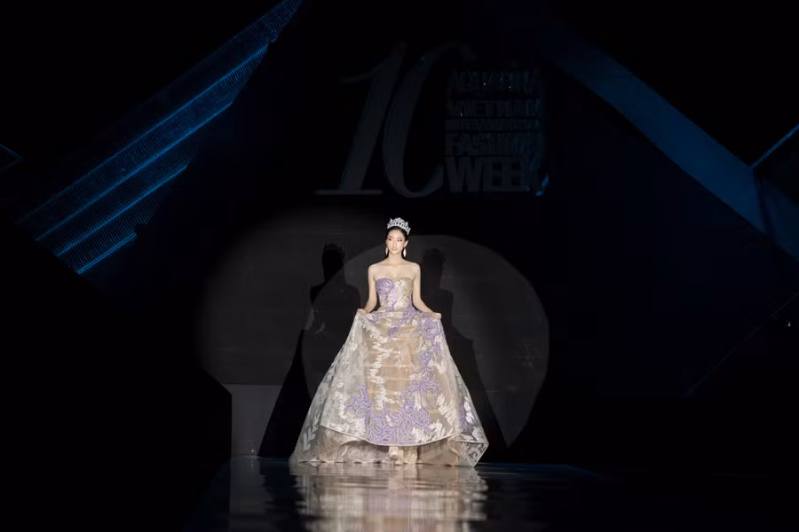 Ngay sau đó, cô nàng đã biến hoá bất ngờ, đầu đội vương miện, lộng lẫy trong chiếc đầm cúp ngực, giữ vai trò vedette trong Bộ sưu tập Come Home của NTK Hoàng Hải. Thần thái chuẩn mẫu Tây đầy cuốn hút cùng những sải bước chuyên nghiệp của Lương Thùy Linh đã mang đến màn kết đầy ấn tượng.