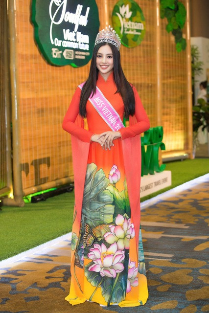 Tiểu Vy xuất hiện cuối cùng, sau 4 Hoa hậu quốc tế trong tà áo dài được cắt xẻ tinh tế và chiếc vương miện quyền quý trên đầu.