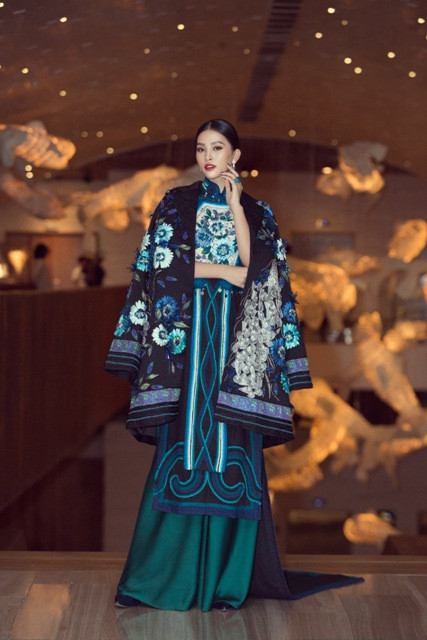 Chiếc váy nhung xanh được thiết kế với ý tưởng dựa trên bộ trang phục của người Hà Nhì. Bản sắc văn hóa của dân tộc Việt Nam được thể hiện khéo léo qua từng đường may họa tiết trên váy, tuy đơn giản nhưng lại giúp cô Hoa hậu nổi bật và khác biệt trong đêm cuối cùng của tuổi 18.