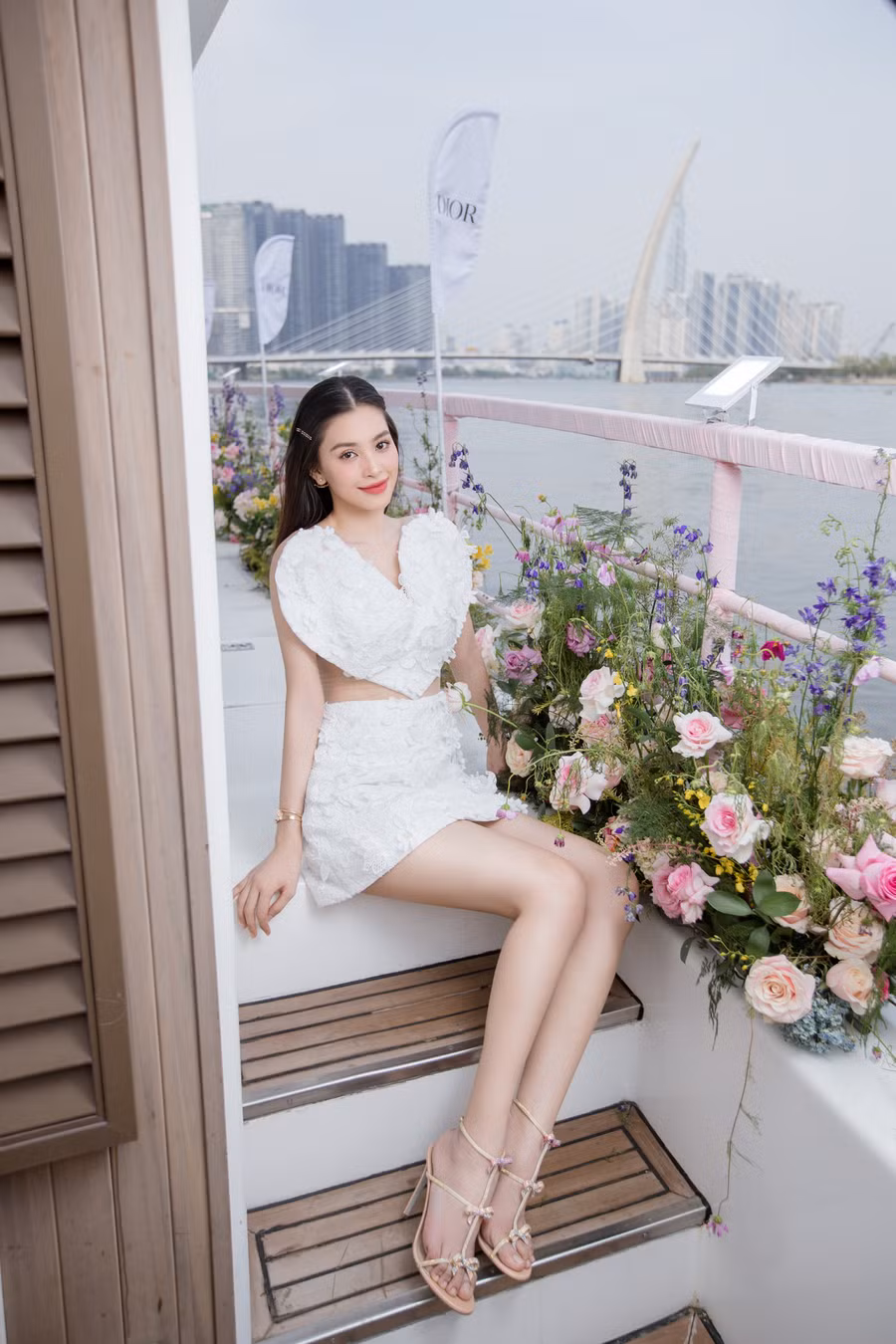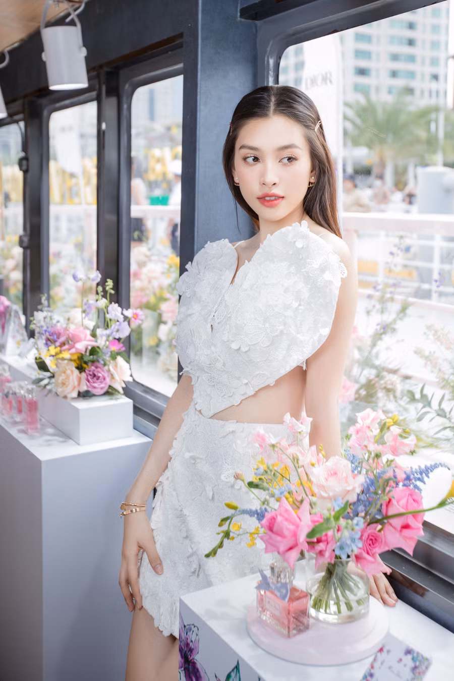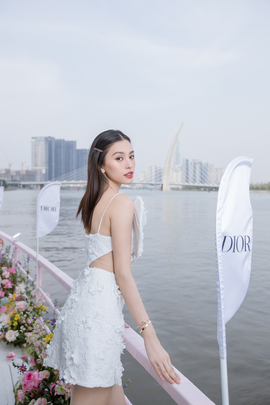 Tại sự kiện trên du thuyền ngàn hoa, Tiểu Vy đã lựa chọn chiếc váy trắng tinh khôi được cách điệu hình trái tim vô cùng ngọt ngào.