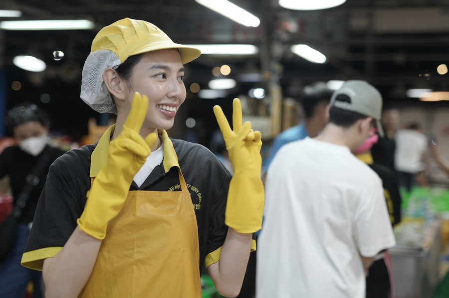 Cả môi trường và cách làm việc đều quá mới mẻ, thú vị với Thùy Tiên và Hòa Minzy. Hai người đẹp rất nhanh hòa đã cùng không khí nhộn nhịp ở chợ, tương tác vui vẻ không khác gì offline-fan. Tới phần học việc là cả một sự hoang mang, ngỡ ngàng.