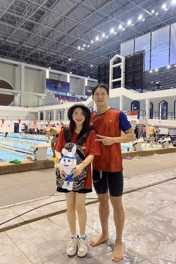 "Đi xe gần 10 tiếng qua đến Campuchia để kịp đón cơn mưa vàng cùng đội tuyển bơi hôm nay. Không gặp được hết mọi người nên gửi lời chúc mừng và cảm ơn sự cố gắng của tất các VĐV ạ", nữ ca sĩ viết.