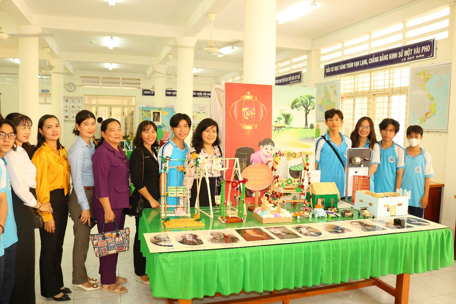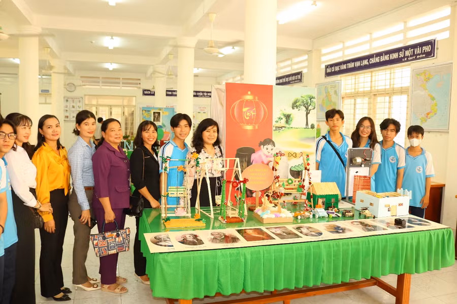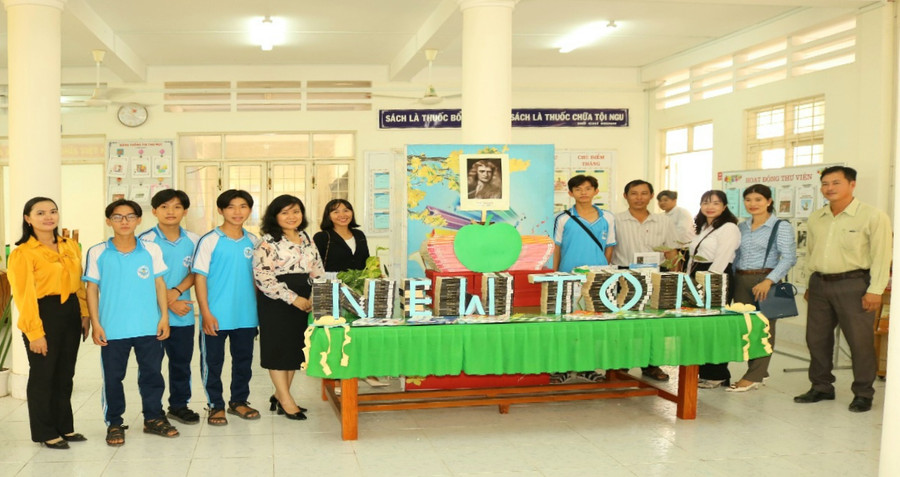 Cũng tại buổi sinh hoạt Chuyên đề các đại biểu và học sinh cùng tham quan các mô hình triển lãm, xếp sách nghệ thuật như: Xếp mô hình tên nhà bác học ISAAC NEWTON, mô hình “Cầu Hàm Rồng”, mô hình Đền thờ “Quản cơ Trần Văn Thành” và một số sản phẩm STEM ứng dụng kiến thức vật lý.
