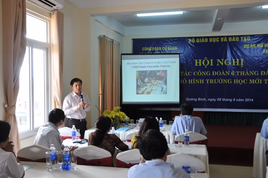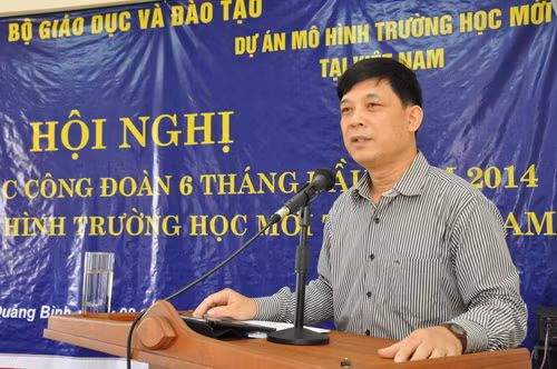 Nội dung "Công tác triển khai thực hiện mô hình trường học mới Việt Nam sau 3 năm học (từ năm học 2011-2012 đến năm học 2013-2014) và tiếp tục triển khai và nhân rộng trong năm học 2014-2015" do đồng chí Hoàng Mai Lê – Điều phối viên sư phạm của Dự án Mô hình trường học mới Việt Nam (VNEN) trình bày.