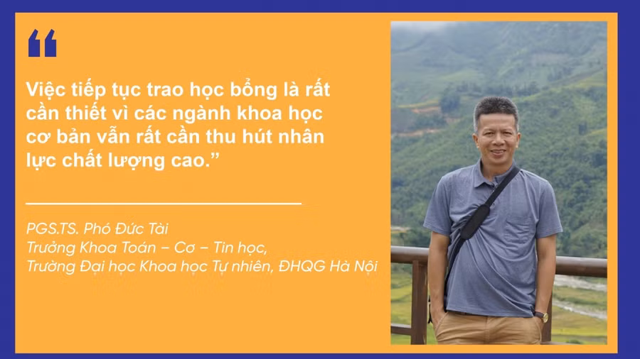 Chia sẻ về chính sách cấp học bổng khuyến khích học tập cho sinh viên ngành Toán, PGS.TS. Phó Đức Tài - Trưởng Khoa Toán – Cơ – Tin học, Trường Đại học Khoa học Tự nhiên, ĐHQG Hà Nội, cho biết: Từ năm 2012 đến 2020, Ban Điều hành Chương trình đều đặn tổ chức xét chọn và trao học bổng cho các học sinh, sinh viên, đã có 15 kỳ xét cấp học bổng với kinh phí hơn 51 tỷ đồng được cấp cho 2223 lượt sinh viên ngành Toán và 3908 lượt học sinh THPT chuyên toán, mỗi suất học bổng trị giá từ 7,35 triệu đến 10,43 triệu đồng/1 học kỳ.