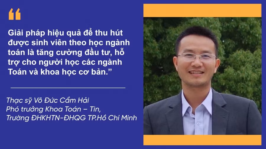 Thạc sỹ Võ Đức Cẩm Hải – Phó trưởng Khoa Toán – Tin, Trường ĐHKHTN-ĐHQG TP Hồ Chí Minh đồng quan điểm khi cho rằng: Trong thời đại 4.0, với nhiều công nghệ lõi dựa trên nền tảng toán học sâu sắc, việc duy trì và nâng cao chất lượng nhân lực ngành toán lại càng trở nên cấp bách. Một trong những giải pháp hiệu quả để thu hút được sinh viên theo học ngành toán là tăng cường đầu tư, hỗ trợ cho người học các ngành Toán và khoa học cơ bản để phát triển nguồn nhân lực phù hợp với thị trường và nền kinh tế tri thức.
