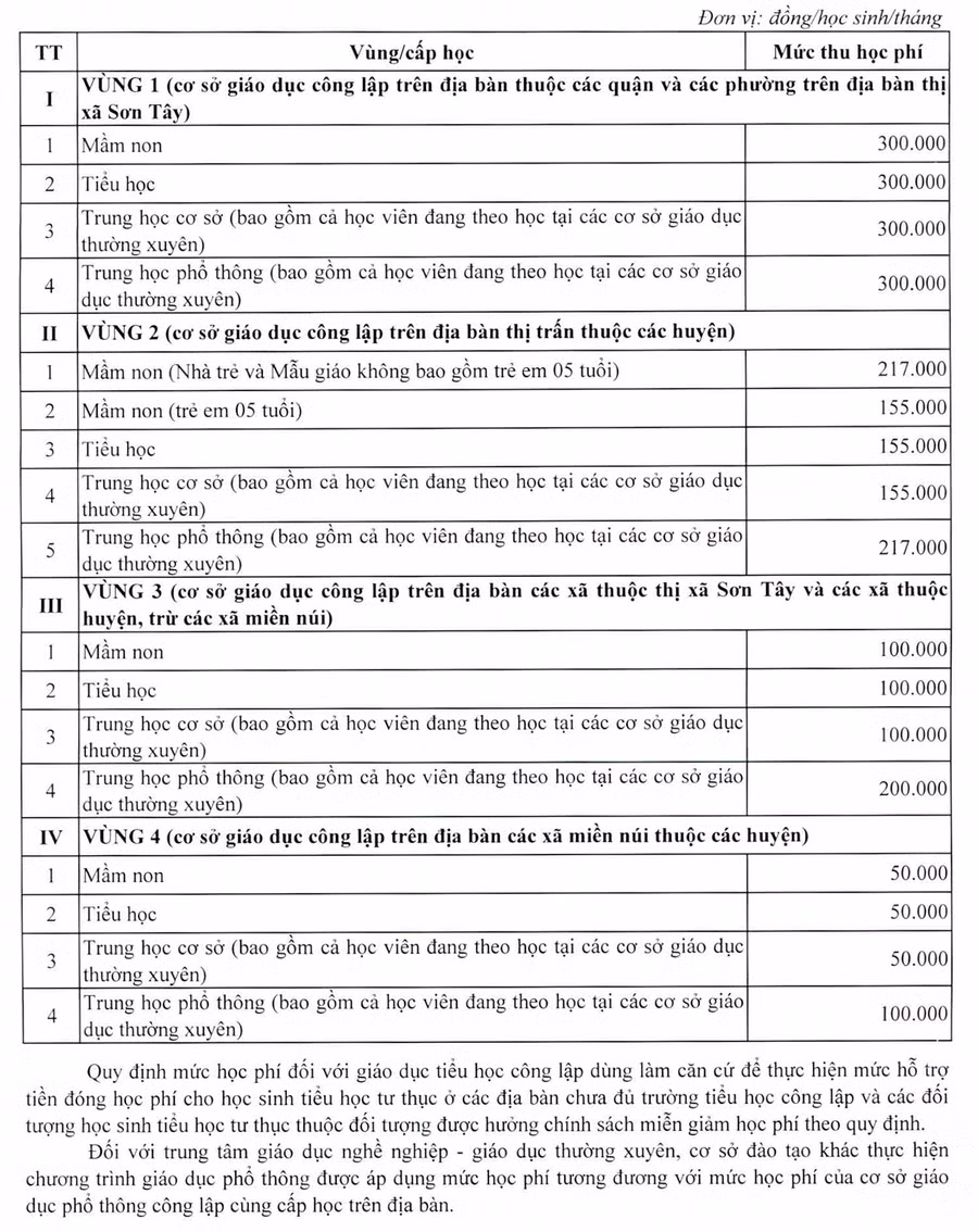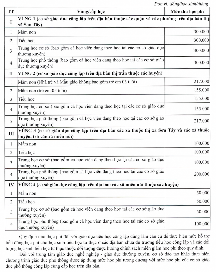 Theo đó, thành phố dự kiến sẽ tăng học phí theo lộ trình do Chính phủ quy định, bắt đầu từ năm học 2022-2023. Toàn thành phố sẽ chia làm 4 vùng gồm: (1) các phường của các quận nội thành và thị xã Sơn Tây, (2) các thị trấn thuộc huyện, (3) các xã của các huyện ngoại thành và thị xã Sơn Tây (4) các xã miền núi thuộc các huyện.