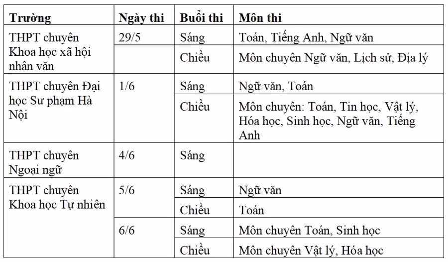 Cùng với kỳ thi của Trường THPT chuyên Khoa học Xã hội và Nhân văn diễn ra ngày 29/5, các trường còn lại THPT chuyên Đại học Sư phạm Hà Nội, THPT chuyên Ngoại ngữ, THPT chuyên Khoa học Tự nhiên đồng loạt tổ chức kỳ thi tuyển sinh lớp 10 trong các ngày từ 1/6 đến 6/6, và nhiều em sẽ tham gia 3 trong 4 kỳ thi đó.