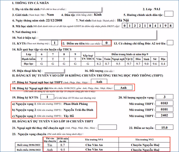 Thời gian kiểm tra, rà soát và đính chính thông tin trên phiếu đăng ký dự tuyển từ 5/5 đến 10/5. Học sinh cần kiểm tra cẩn thận, kỹ lưỡng và đối chiếu thông tin trên phiếu đăng ký dự tuyển được in từ chương trình Quản lý thi với phiếu đăng ký dự tuyển đã kê khai; đặc biệt lưu ý những thông tin liên quan đến đối tượng ưu tiên, ngoại ngữ đăng ký thi, nguyện vọng dự tuyển.