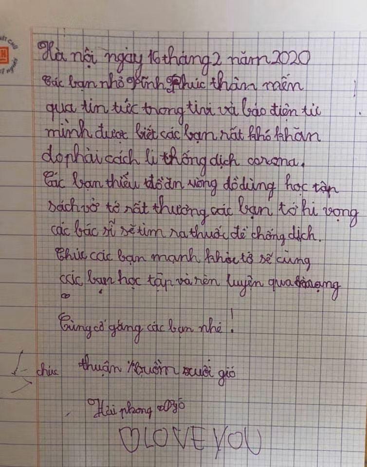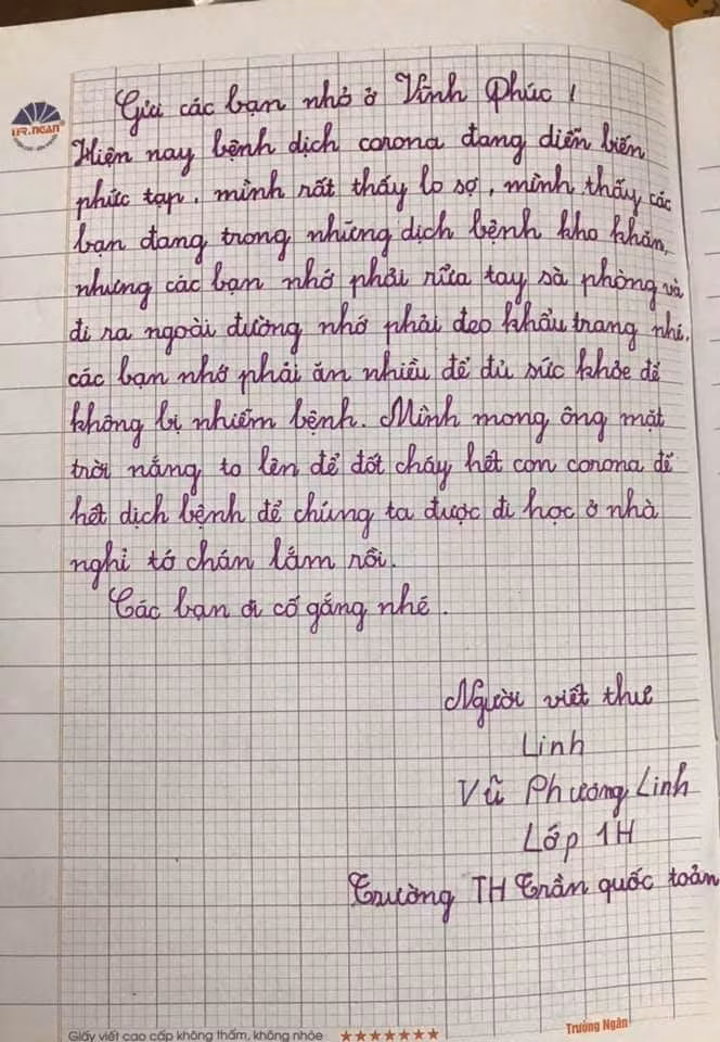 Còn một cô giáo viết rằng: Các bạn nhỏ thật đáng yêu, chúc các bé luôn mạnh khoẻ, luôn là niềm tự hào của thầy cô, gia đình và bè bạn, những người luôn yêu thương các bé. Nhất định chúng ta sẽ chiến thắng con virus Covid 19 để các bé lại được tung tăng đến trường!