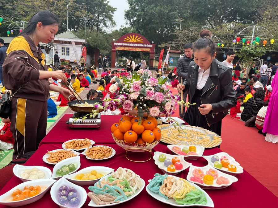 Tại sân trường rộn rã tiếng nhạc và tiếng nói cười náo nức, học sinh rất hào hứng với hoạt động gói bánh chưng, làm bánh nhãn, mứt Tết, trang trí mâm ngũ quả…