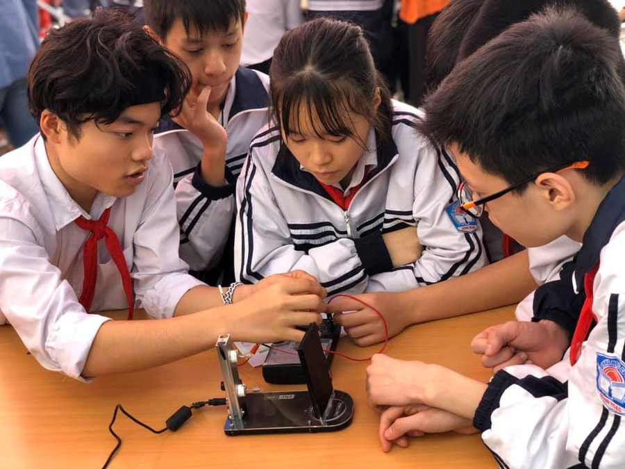 | Học sinh trải nghiệm thiết bị STEM tự làm |