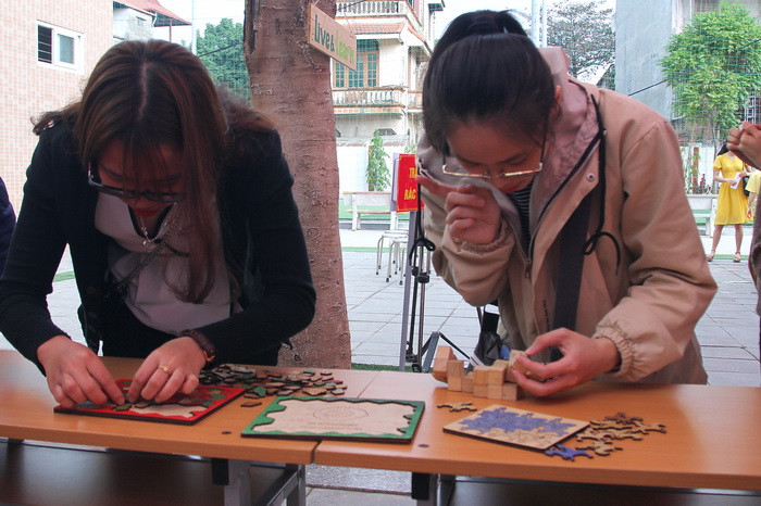 | Giáo viên tham khảo tài liệu và trải nghiệm các bộ dụng cụ STEM. Ảnh: Việt Hà |