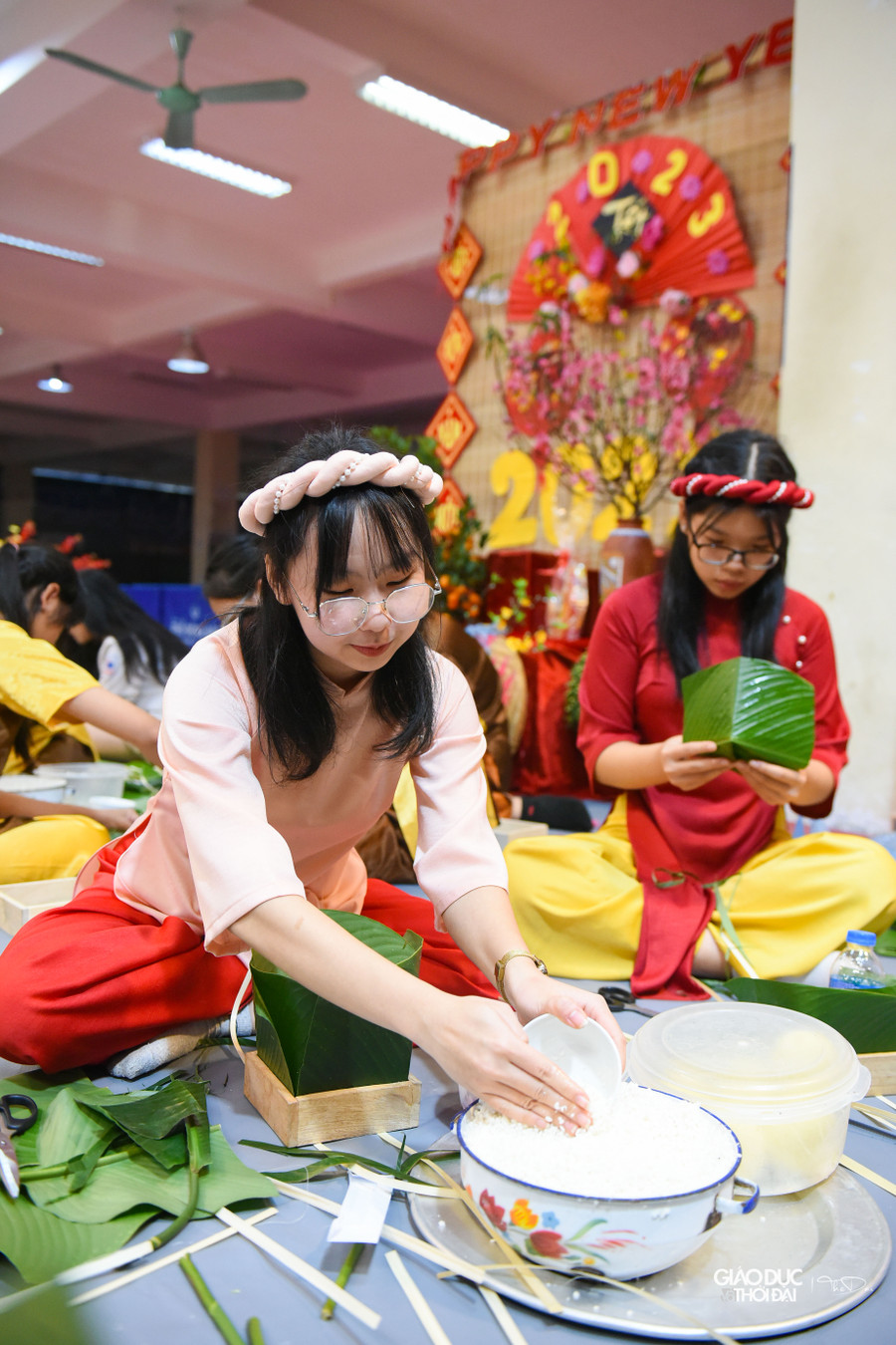| Các bạn học sinh hào hứng vào cuộc thi gói bánh chưng. |