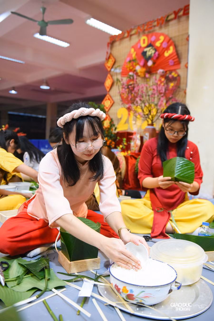 | Những đội thi chuẩn bị cho cuộc thi gói bánh chưng. |