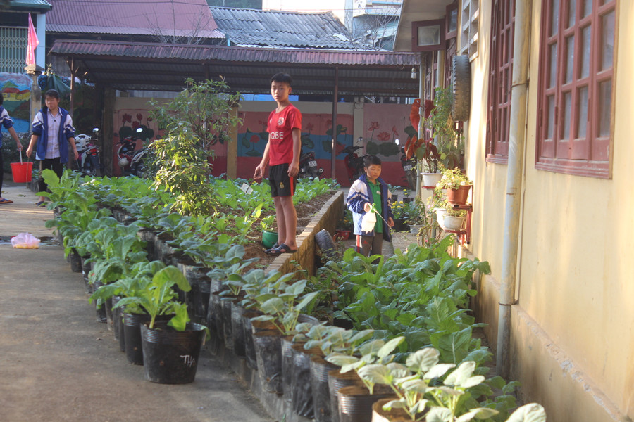 Thầy Nguyễn Văn Tùy, Phó Hiệu trưởng Trường PTDT nội trú THCS Mường Đun, Tủa Chùa (Điện Biên) cho biết: “Nhà trường dành hơn 300 m2 đất để HS trồng rau xanh. Giáo viên chủ nhiệm và HS các lớp được phân công cụ thể phụ trách khu vực trồng của lớp mình, trồng rau theo mùa. Rau thu hoạch được dùng làm thực phẩm cho chính bữa ăn của HS”.