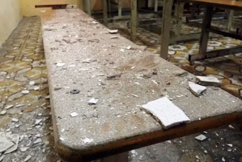 Chiều 20/10, học sinh và thầy cô giáo trường THPT Trần Nhân Tông chứng kiến nhiều mảng vữa trần nhà tại nhiều lớp học bị vỡ, rơi xuống sàn.