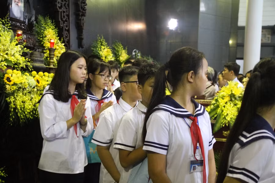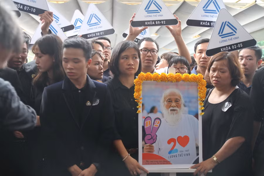 Các thế hệ học sinh trường Lương Thế Vinh không hẹn mà gặp đã cùng nhau tập trung tại nhà tang lễ, xếp hàng chờ đến lượt nhìn người thầy lần cuối.