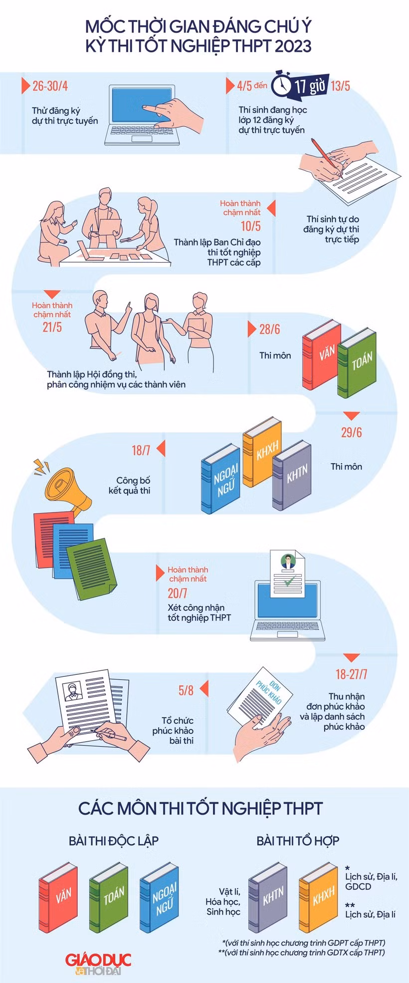 Kỳ thi tốt nghiệp THPT năm 2023 sẽ được tổ chức trong hai ngày 28-29/6. Kỳ thi tổ chức thi 5 bài thi, gồm: 3 bài thi độc lập là Toán, Ngữ văn, Ngoại ngữ; 1 bài thi tổ hợp Khoa học Tự nhiên gồm các môn thi thành phần Vật lí, Hóa học, Sinh học; 1 bài thi tổ hợp Khoa học Xã hội gồm các môn thi thành phần Lịch sử, Địa lí, Giáo dục công dân đối với thí sinh học chương trình giáo dục phổ thông cấp THPT hoặc các môn thi thành phần Lịch sử, Địa lí đối với thí sinh học chương trình Giáo dục thường xuyên cấp THPT.