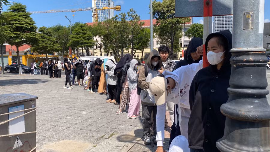 | Nhiều bạn trẻ "đội nắng" để xếp hàng đợi đến lượt vào mua vé. |