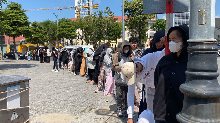 | Càng về trưa, lượng người xếp hàng đợi đến lượt mua vé càng đông, kéo dài từ đầu rạp Lê Độ đến đường Lê Duẩn. |