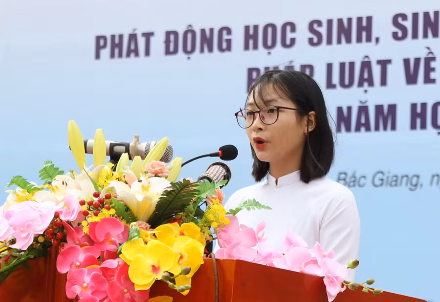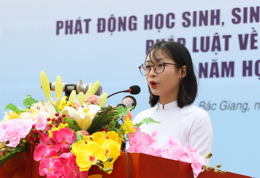 Em Nguyễn Thu Hoài- Học sinh lớp 11A1 Trường THPT Giáp Hải phát biểu hưởng ứng lễ phát động.