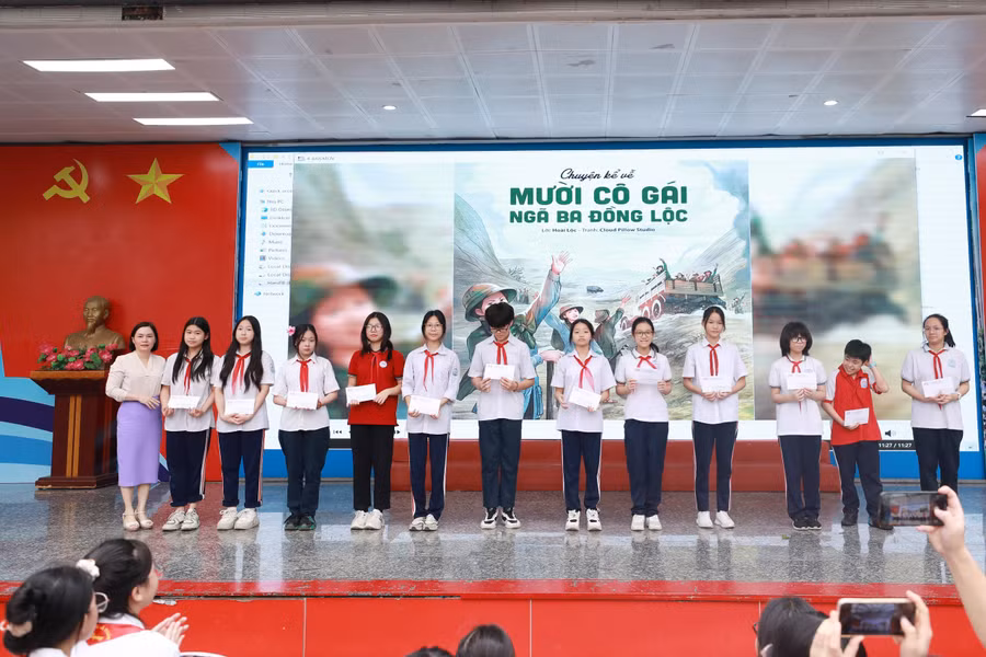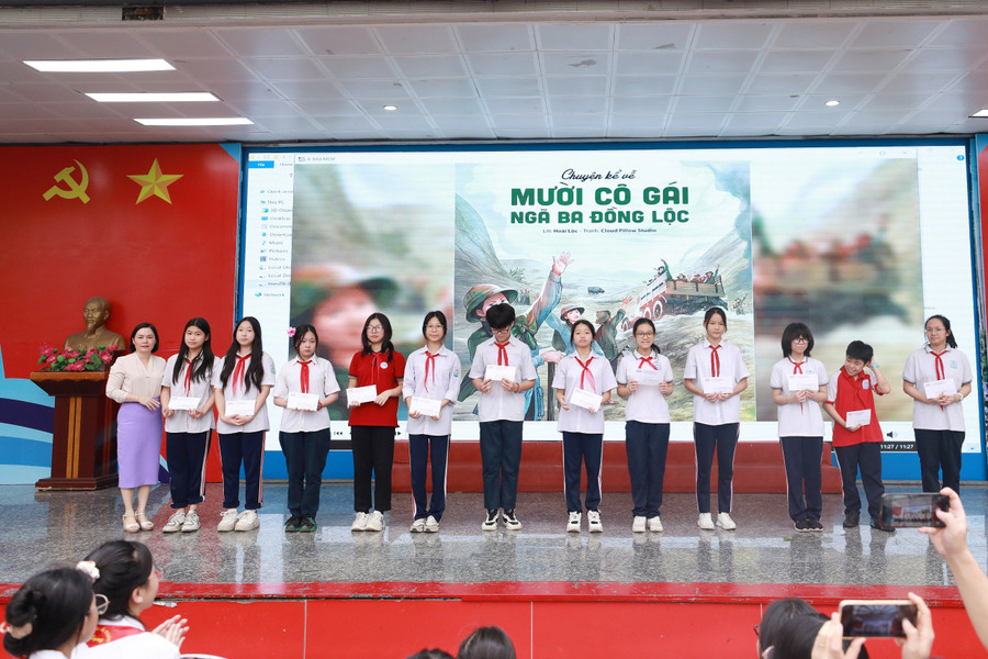 Các em học sinh trường THCS Mai Dịch đã gửi tới các thầy cô giáo và các bạn học sinh, phụ huynh một cuốn sách hay như để thắp một nén tâm nhang bày tỏ tình cảm tri ân sâu sắc của chúng ta đến mười cô gái anh hùng nơi Ngã ba Đồng Lộc thân thương, tới các chiến sĩ thanh niên xung phong và tới lớp lớp cha anh đã đổ máu xương hi sinh cho nền độc lập tự do dân tộc...", bà Thu chia sẻ.