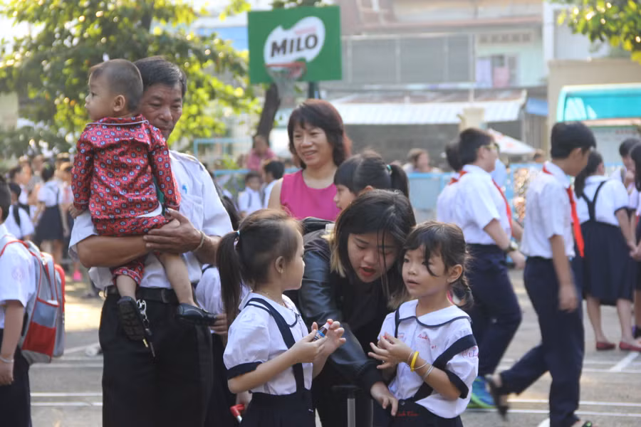 Theo đó, năm nay trường có 150 HS lớp 1 với 4 lớp, nâng tổng số HS của trường lên khoảng 750 em. Từ sáng sớm, các em được gia đình dẫn tới trường với nhiều cung bậc cảm xúc. Hầu hết các em tỏ ra háo hức, hớn hở khi được làm quen với nhiều bạn mới, nhưng một vài em lần đầu tiên tới trường vẫn còn bỡ ngỡ, bật khóc đòi về theo khi ba mẹ ra về.
