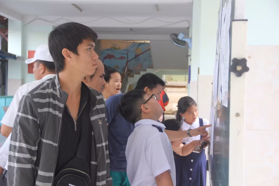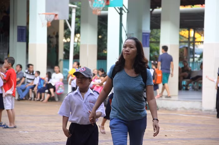 Ghi nhận tại Trường Tiểu học Cửu Long, quận Bình Thạnh, từ sáng sớm, phụ huynh đã đưa các bé lớp 1 tới trường để làm quen bạn, làm quen cô giáo. Đúng 7h30, các em bắt đầu vào lớp và chuẩn bị cho buổi học đầu tiên.