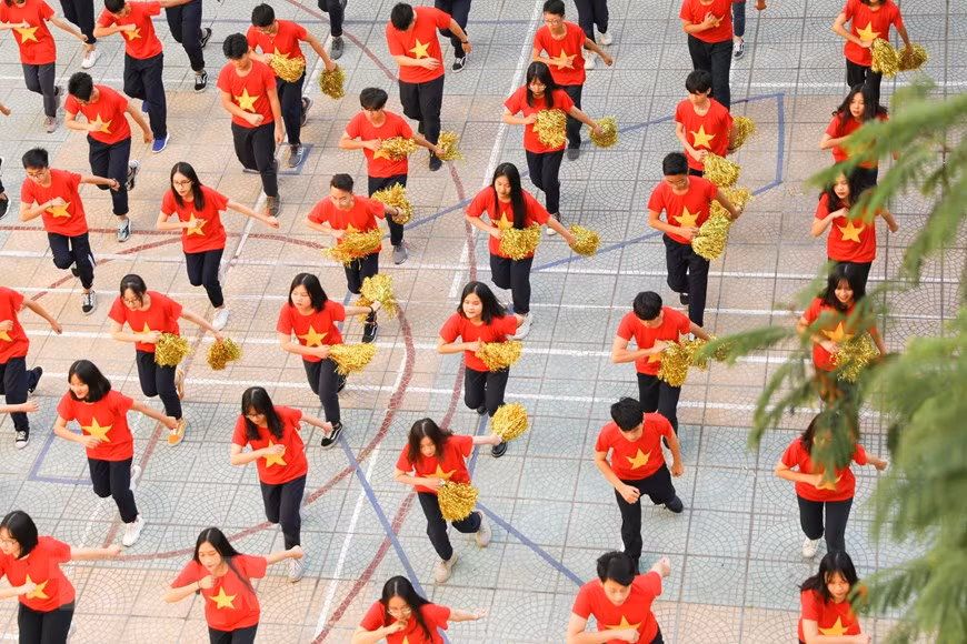Trên nền nhạc sôi động, hàng trăm học sinh trường THPT Trần Nhân Tông (Hà Nội) đã hòa mình vào điệu nhảy và xếp hình bản đồ Việt Nam để gửi tặng các thầy cô giáo nhân Ngày Nhà giáo Việt Nam 20/11.