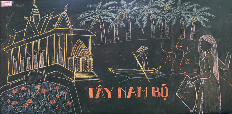 Nhìn vào bức tranh phác họa cảnh sông nước của lớp 12A1, người xem liên tưởng ngay đến vùng sông nước Tây Nam bộ với phiên chợ nổi tấp nập xuồng ghe bên bóng cây dừa xanh mát. Thấp thoáng đằng sau vườn cây sum suê trái ngọt là ngôi chùa cổ kính của đồng bào Khơ - me và mùi thơm của những cánh sen hồng như thoang thoảng đâu đây.