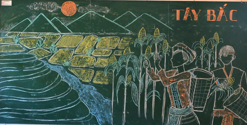 Một bức tranh khác, dù nếu không chú thích thì người thưởng lãm vẫn đoán ra được, đó là vẽ về vùng đất Tây Bắc xinh đẹp với ruộng bậc thang như chiếc váy xòe của cô sơn nữ. Chưa học bài Việt Bắc của nhà thơ Tố Hữu với câu thơ: “Nhớ người mẹ nắng cháy lưng/ Địu con lên rẫy bẻ từng bắp ngô” thì người “họa sĩ áo trắng” của lớp 12 khó mà bắt được cái hồn như thế. Có thể coi đây là bản thu hoạch bằng nét cọ của học sinh qua các tác phẩm Vợ chồng A Phủ (Tô Hoài), Rừng xà nu (Nguyễn Trung Thành), Tây Tiến (Quang Dũng), Những đứa con trong gia đình (Nguyễn Thi)… trong chương trình học kỳ 1 của lớp 12.