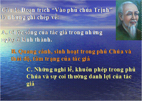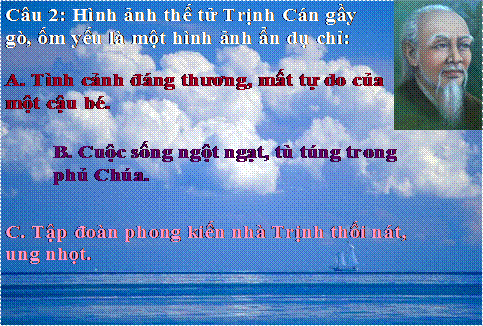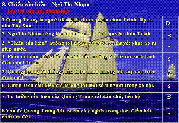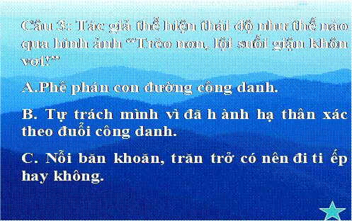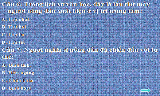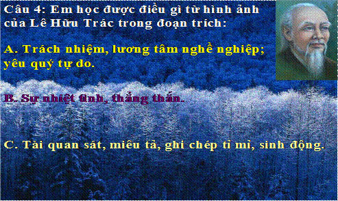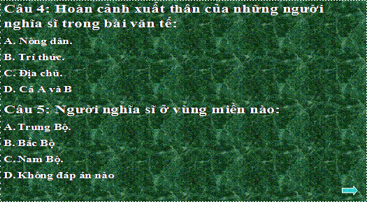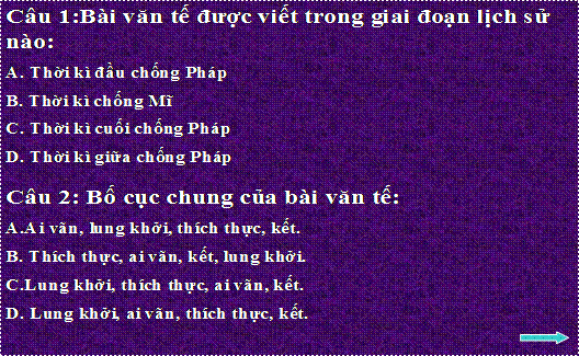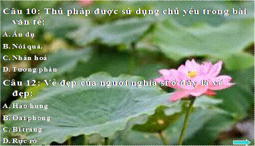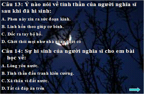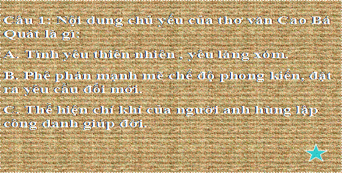 Giáo viên đưa ra tháp câu hỏi gồm 4 câu, chia lớp thành hai đội, mỗi đội chuẩn bị 3 tờ giấy ghi các đáp án A, B, C