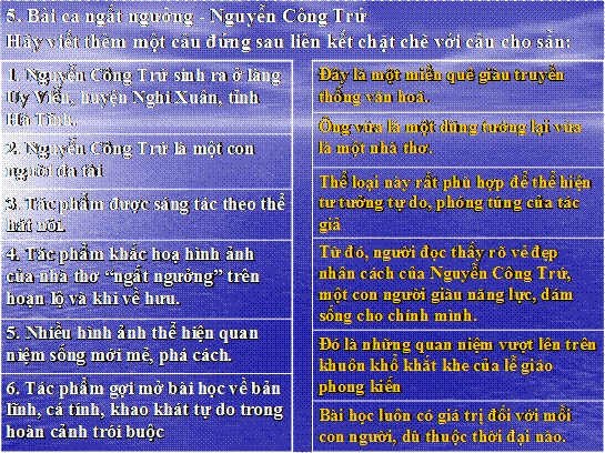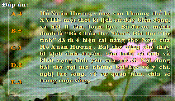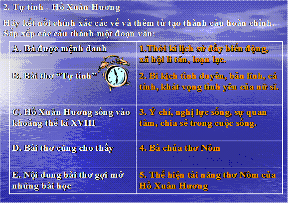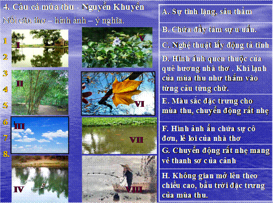 Giáo viên đưa ra bảng gồm có số thứ tự các câu trong bài thơ, chia lớp thành 4 nhóm làm việc, mỗi nhóm sẽ nối câu thơ với hình ảnh và với ý nghĩa tương ứng, hoàn thành vào giấy và nộp lại sau 2 phút. Mỗi đáp án đúng được 10 điểm, nộp sớm nhất và đúng nhiều nhất được cộng 20 điểm. Nhóm nào được nhiều điểm nhất sẽ thắng.