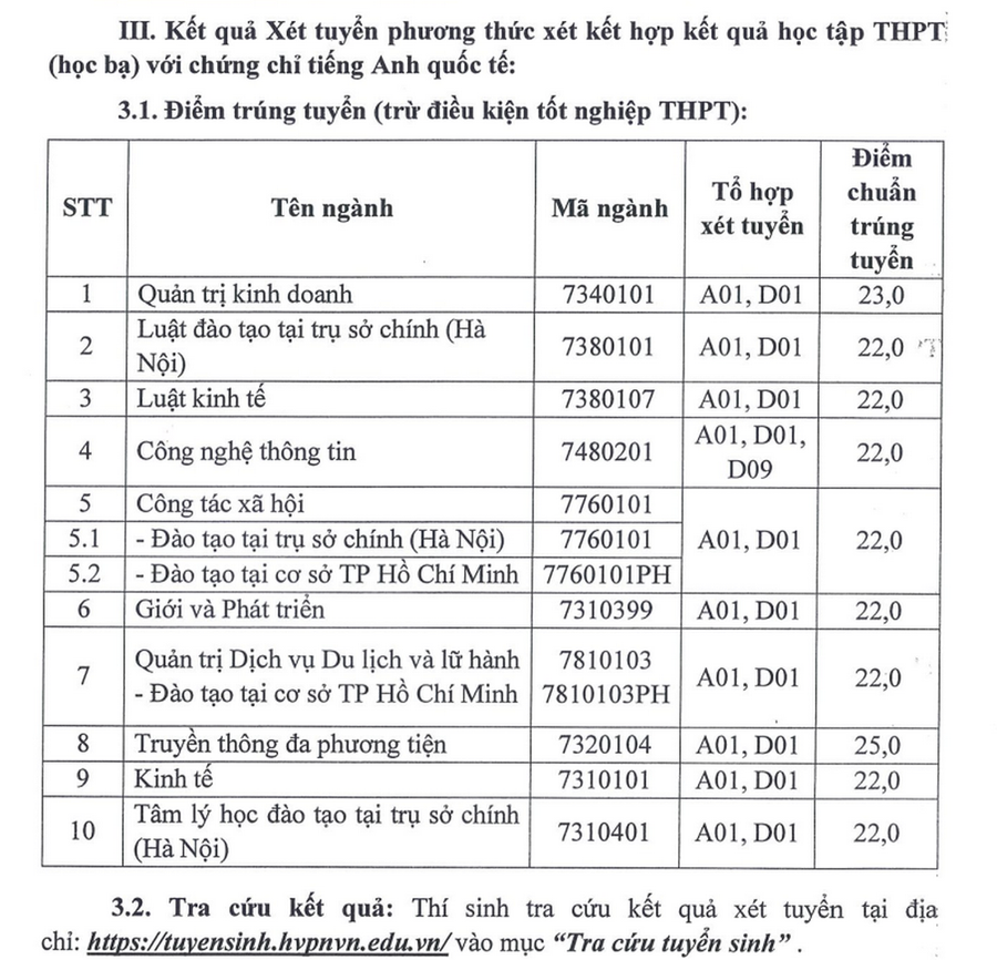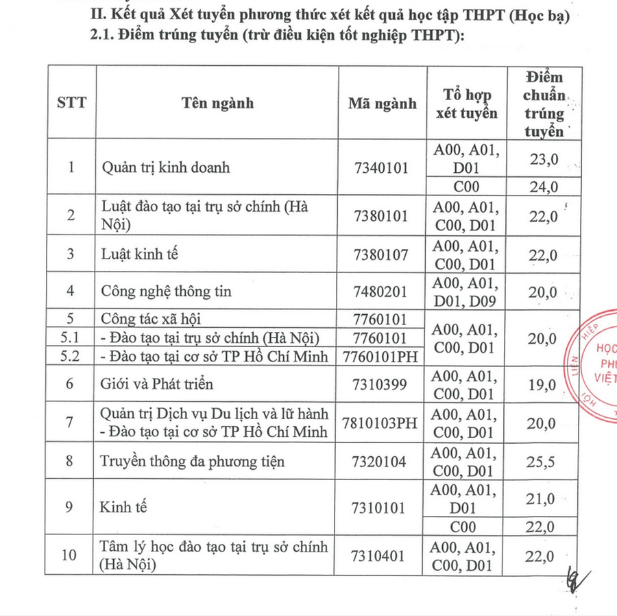 Theo đó, điểm chuẩn trúng tuyển (trừ điều kiện tốt nghiệp THPT) theo phương thức xét kết quả học tập THPT là từ 19 đến 25,5 điểm. Trong đó, ngành Giới và Phát triển có mức điểm chuẩn là 19 điểm. Ngành truyền thông đa phương tiện có mức điểm chuẩn là 25,5.