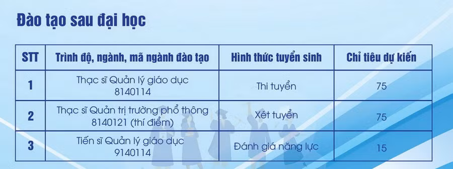 | 1 | Quản lý giáo dục | 7140114 | 100 | Xét kết quả thi tốt nghiệp THPT | 200 | A00 | A01 | C00 | D01 |