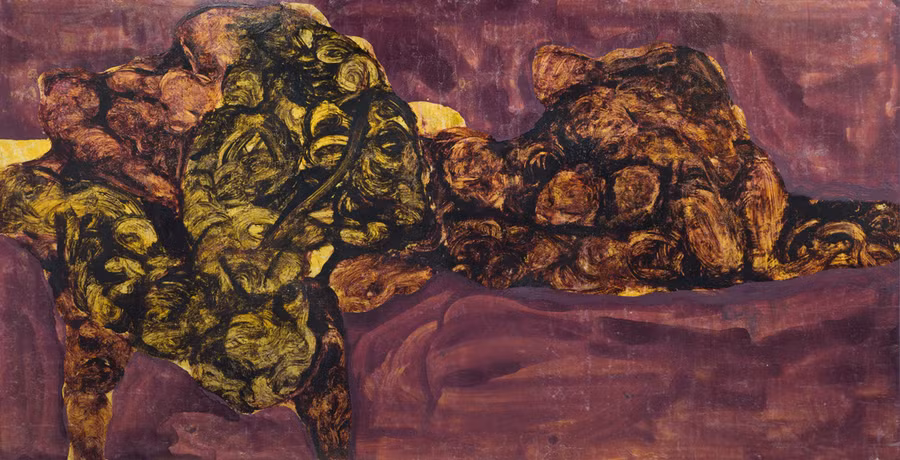 Cho đến những loạt tranh khổ lớn, có kịch tính, câu chuyện chỉ có cảm nhận thì rõ nhưng khó thuật lại bằng lời. Bằng hòa hợp như thế giữa họa và nhạc để xem tranh của Nguyễn Ngọc Phương, có thể thấy vẻ sang trọng, mãnh liệt, đậm đà muốn thoát đời của một con người du ngoạn từ khi còn trẻ. Sắc tranh khổ lớn giống như tường đền, miếu cổ, hoặc như vẩy, da của những loài vật huyền thoại.