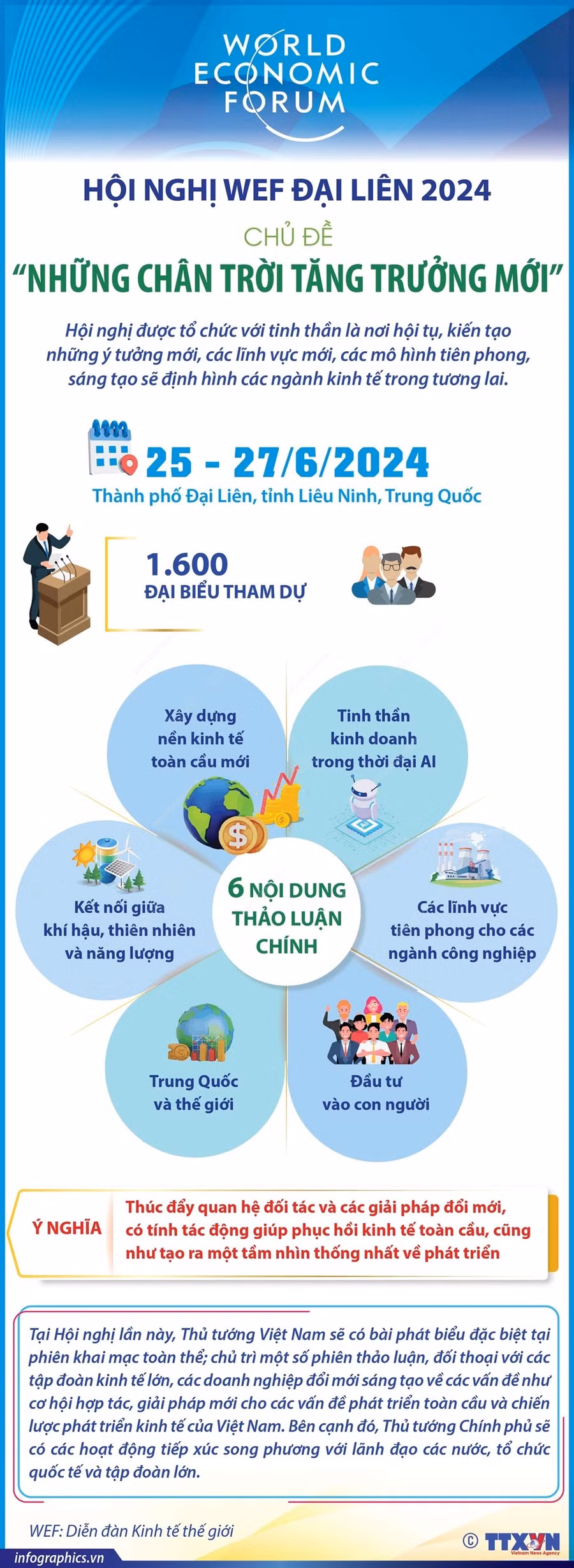 Hội nghị thường niên các nhà tiên phong lần thứ 15 của Diễn đàn Kinh tế Thế giới (WEF) diễn ra từ ngày 25-27/6 tại thành phố Đại Liên, tỉnh Liêu Ninh, Trung Quốc với chủ đề “Những chân trời tăng trưởng mới.”