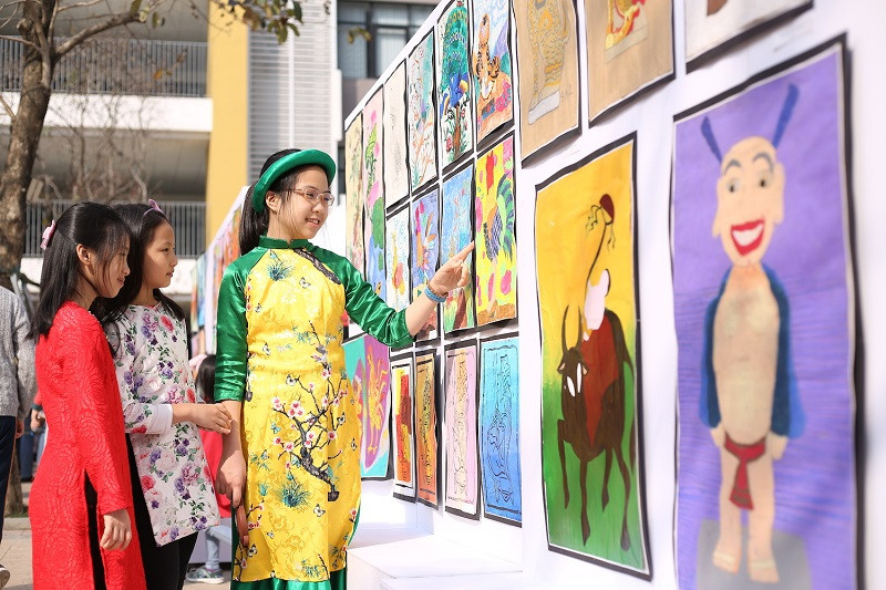 Nhiều khách mời ấn tượng với khu triển lãm nghệ thuật của các học sinh. Mỗi tác phẩm là một cảm nhận riêng của từng em về ngày Tết của Việt Nam. Qua những tác phẩm nghệ thuật độc đáo của chính bạn bè mình, các em có cơ hội tìm hiểu thêm kiến thức về những phong tục tập quán lâu đời của dân tộc, thêm yêu và trân trọng những giá trị văn hóa truyền thống.