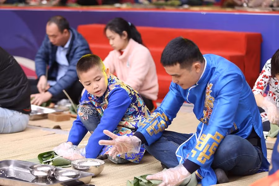 Hướng tới kết nối tình cảm yêu thương trong gia đình, Hội Xuân cũng tổ chức hoạt động thi Gói bánh chưng, bánh tét theo cặp bố/ mẹ và con. Trải nghiệm này đã khiến không ít người được quay trở về những ký ức Tết xưa khi bố mẹ và con cùng hướng dẫn nhau ngồi gói bánh chưng trong những ngày giáp Tết.