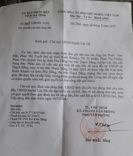 Cụ thể, nội dung Công văn nêu rõ: “UBND tỉnh nhận được đơn của các ông, bà: Phan Văn Đắc, Phan Thị Tuyết, Võ Tá Duẫn, Phan Thị Chiến, Phan Văn Quýnh (trú thị trấn Lộc Hà) phản ánh về việc các gia đình đã nộp tiền để mua đất tại UBND xã Thạch Bằng từ năm 2015 để được cấp đất ở tại địa phương nhưng đến nay chưa được giao đất thực địa và cấp giấy chứng nhận quyền sử dụng đất.
