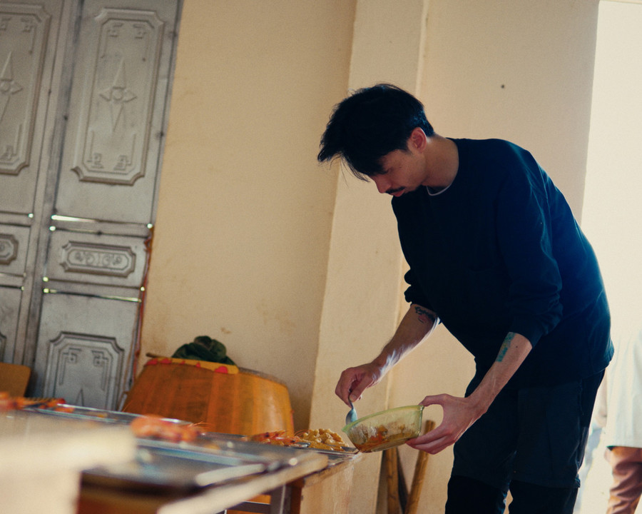 Cùng với các thầy cô giáo, nam rapper còn tự tay vào bếp nấu cơm, chuẩn bị các phần ăn và chơi đùa cùng các em nhỏ tại nơi đây.