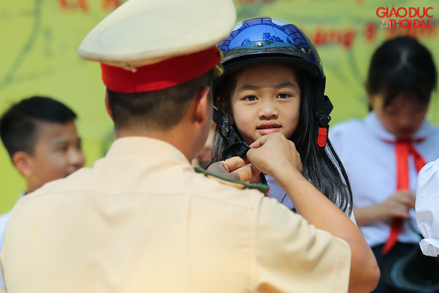 | Học sinh được các đồng chí CSGT hướng dẫn đội mũ bảo hiểm đúng cách. |
