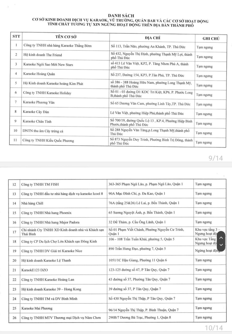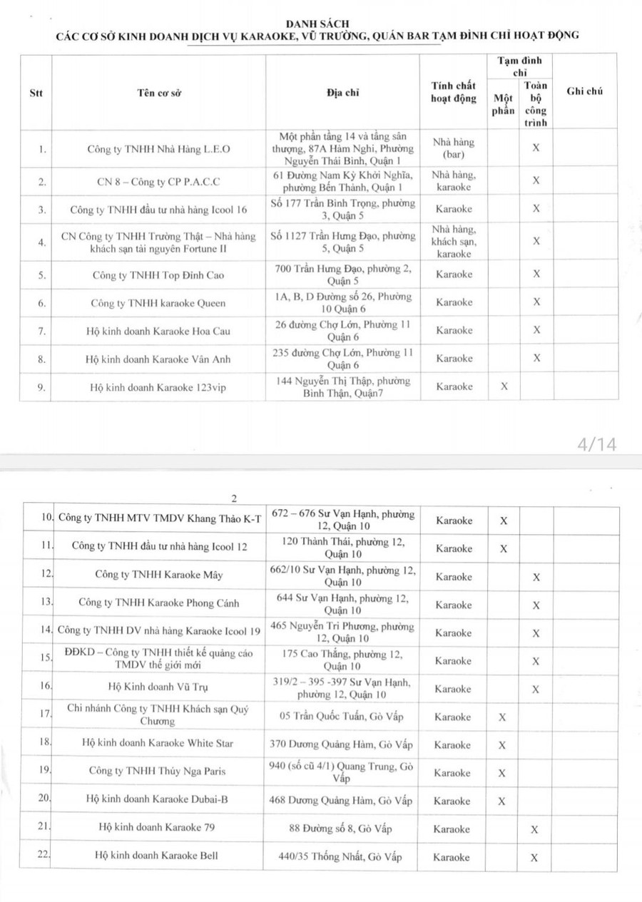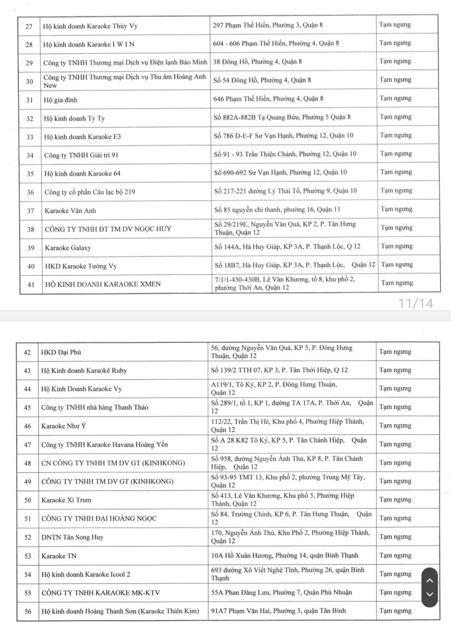 | Danh sách 50 cơ sở kinh doanh dịch vụ karaoke, vũ trường, quán bar trên địa bàn TPHCM bị tạm đình chỉ hoạt động. |