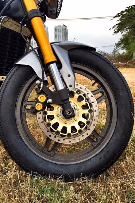 Xe được trang bị bộ phanh đĩa trước hiệu Brembo HP SBK 305mm, cặp phuộc trước thửa từ mẫu Yamaha FZ800.