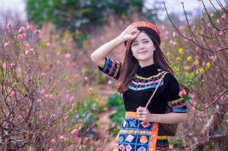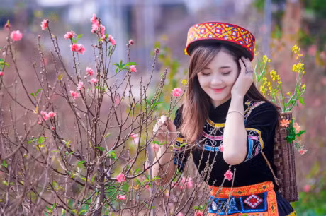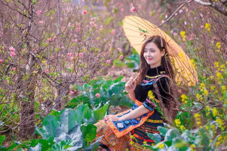 Lựa chọn trang phục của phụ nữ dân tộc thiểu số, Thu Hương hòa mình vào khung cảnh ngập tràn sắc xuân tại một khu vườn hoa đào, hoa cải. Ảnh: Trần Lâm.